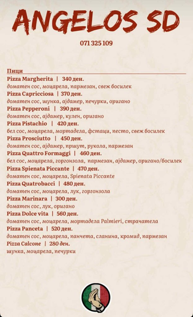 Нашата препознатлива неаполска пица има тенка, крцкава кора печена до совршенство во фурна. Прелиена со свежа моцарела, кисел сос од домати, миризливи листови босилек и малку екстра девствено маслиново масло, секој залак нуди совршена рамнотежа на вкусови што ве носи во срцето на Неапол. Сервирана во нашиот пријатен амбиент, оваа пица ветува автентично и восхитувачко искуство со јадење.